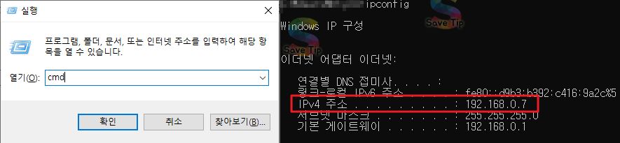 명령 프롬프트에서 ipconfig를 입력하여 나타나는 IPv4 주소와 기본 게이트웨이 IP를 확인합니다.