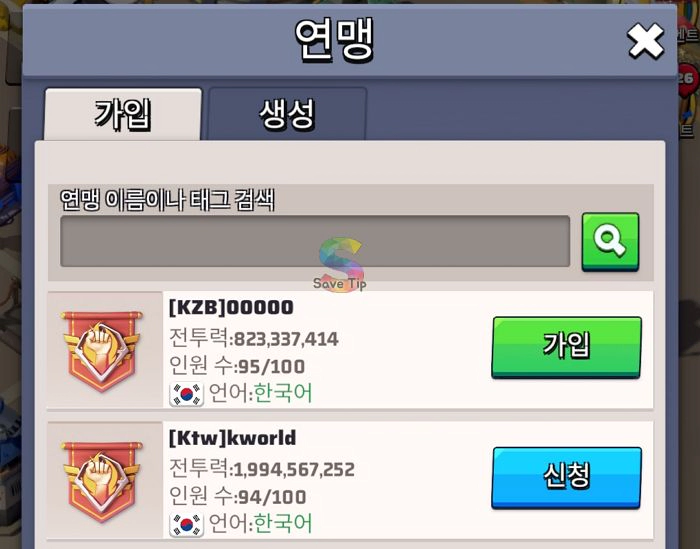 화면 오른쪽에 있는 파란색 연맹 버튼을 탭하고 목록에서 하나를 선택한 후 가입 버튼을 누르면 연맹에 가입할 수 있습니다.